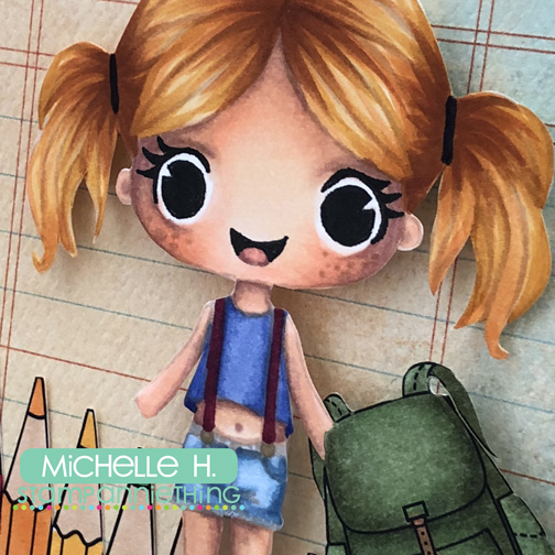 Here is a close up of the adorable Madison and her back pack from the die cut set. I cut a slit along the edge of the backpack so it would look like she is carrying her bag: