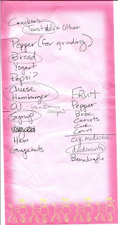 Here is a typical grocery list for me I thought it would be fun to actually scan it so you can see my mess. Because we have been away it was mostly produce needing replacing (we eat more then a small army in the produce department!) Grapes, peaches, apples, cherries, and blueberries were in there for fruit and then peppers, cucumbers, carrots, broccoli and lettuce for vegis. The circles are all the items I have to go get a different store. Blahhh. I could do all my shopping at one but it is quite a bit more expensive if I do. Any way here it is.