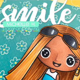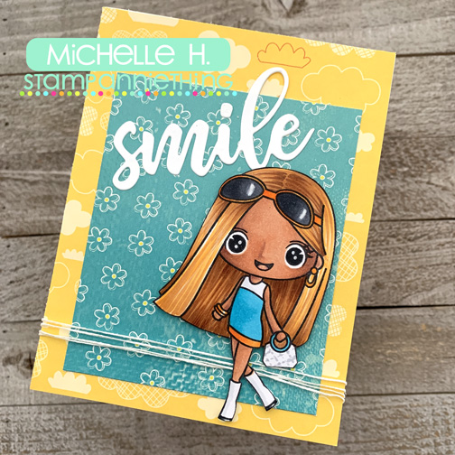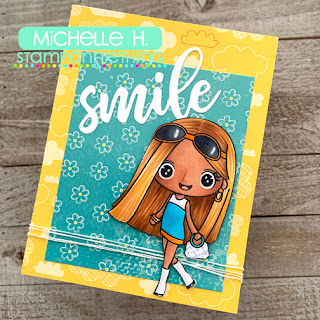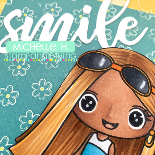 Hello friends and family! I am checking in on this fine hump day to share a little SAT inspiration! I am creating a fun card with this month’s amazing release. The stamp is Kimmie – So Jazzed and she is GREAT for practicing coloring long hair! Love her gorgeous long straight hair. I am coloring with my Copic markers to color her up and then I used a few simple patterned papers for a bright cheerful base. I also used this month’s word die Smile! I mean who can’t use a smile through the mail?!