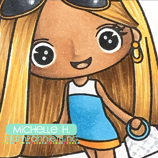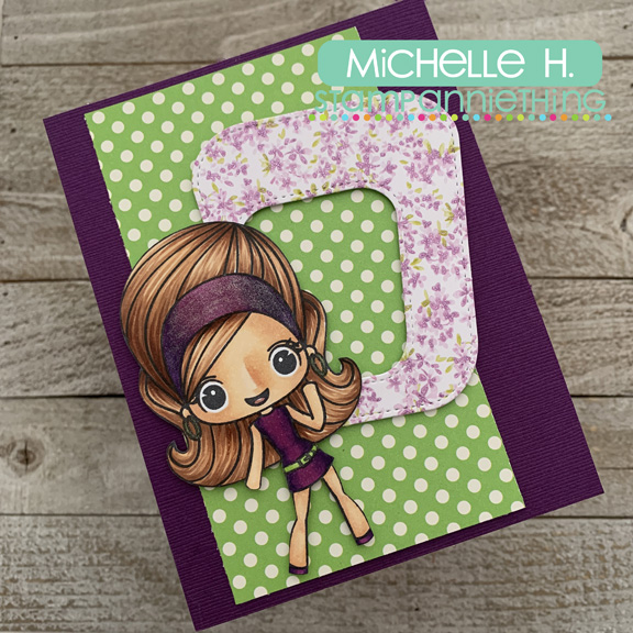 This week I have “Bridget Hang Loose Today” popping by. I colored her up with my Copic markers then created a very simple card base with one of the new dies this month.